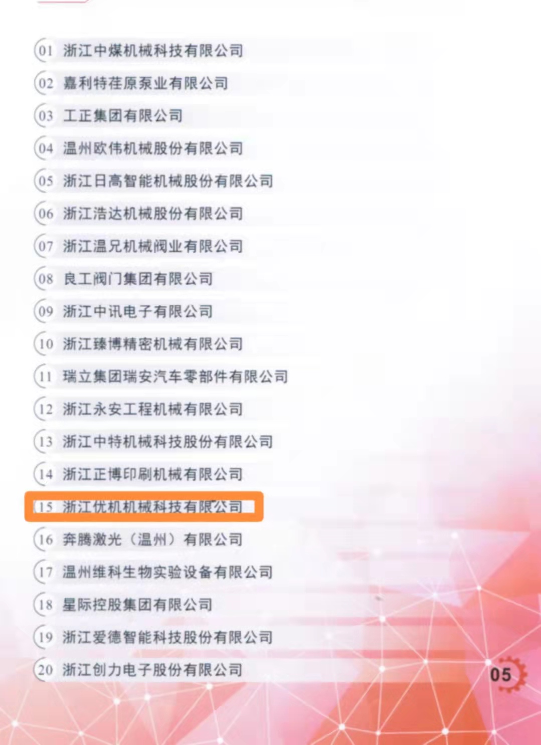 浙江優(yōu)機(jī)機(jī)械科技有限公司 在溫州市智造業(yè)高質(zhì)量發(fā)展大會(huì)入榜溫州好產(chǎn)品智造新勢(shì)力光榮榜,主辦單位溫州市經(jīng)濟(jì)和信息化局。