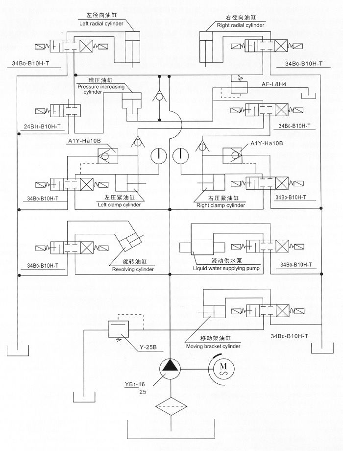 本機(jī)結(jié)構(gòu)大致可分為液壓系統(tǒng)、電器控制系統(tǒng)、左右工作臺(tái)活動(dòng)夾爪和液動(dòng)供壓裝置及介質(zhì)循環(huán)系統(tǒng)等部件組成。右邊工作臺(tái)設(shè)有夾緊機(jī)構(gòu)和 90度翻轉(zhuǎn)機(jī)構(gòu),夾緊機(jī)構(gòu)由夾爪的夾緊裝置和徑向移動(dòng)裝置組成,夾爪的夾緊裝置是采用各油缸直接驅(qū)動(dòng)來(lái)實(shí)現(xiàn),使各爪受力均勻,夾緊可靠。夾爪的徑向移動(dòng)裝置是采用杠桿式結(jié)構(gòu),實(shí)現(xiàn)了各爪徑向同步移動(dòng)。左邊工作臺(tái)可自動(dòng)進(jìn)退。并具有性能好,結(jié)構(gòu)簡(jiǎn)單緊湊等特點(diǎn)。液壓電器控制系統(tǒng) (詳見(jiàn)液壓和電器原理圖)安裝在底層固定架內(nèi),是測(cè)試臺(tái)的控制部分,在與電器聯(lián)合控制下使各機(jī)構(gòu)能協(xié)調(diào)動(dòng)作,滿足測(cè)試程序要求。